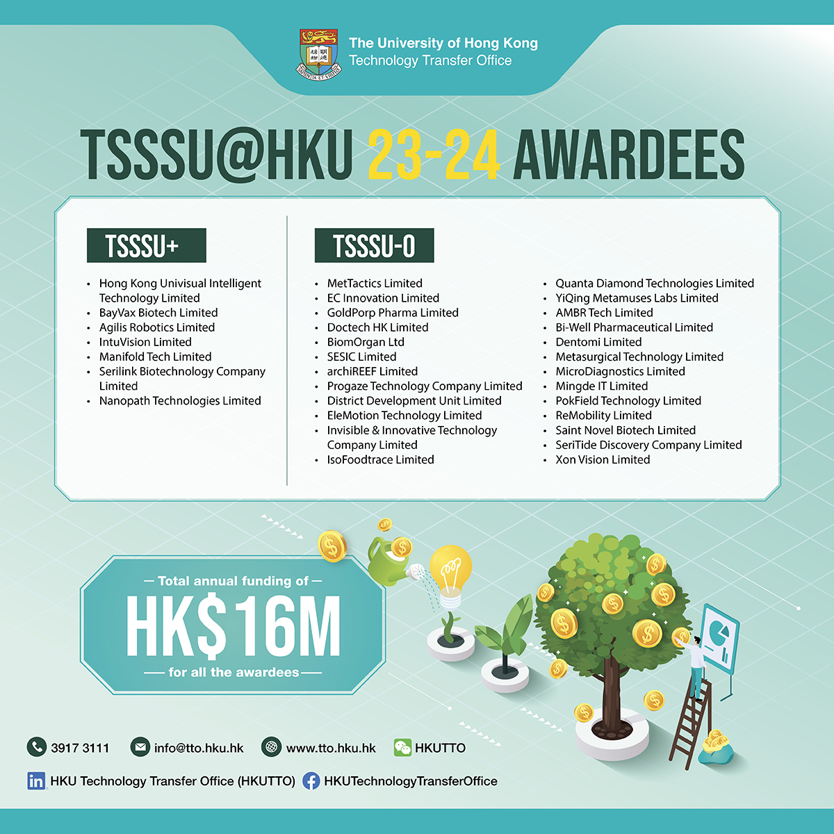 Congratulations to the following 32 HKU start-up companies who were awarded TSSSU@HKU FY23-24 funding by ITC.