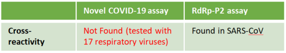 - A novel real-time COVID-19 RT-PCR assay targeting the RdRp/Hel was developed. To avoid cross-reactivity with human SARS-CoV, the probes of the assay were designed to contain 7-9 nucleotide differences with those of human SARS-CoV. This assay is more sensitive and more specific in comparison to the RdRp-P2 assay which is used in >30 European laboratories.