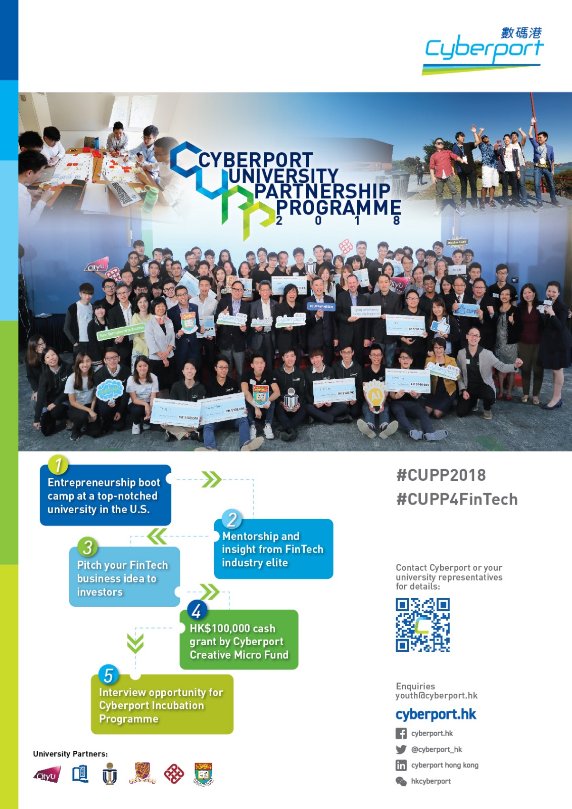 Cyberport University Partnership Programme (CUPP) is a FinTech-focused elite entrepreneurship programme for local university students to unleash their potential, gain insights into the global market, and receive world-class Entrepreneurship Boot Camp and mentorship in Hong Kong and in the U.S.
