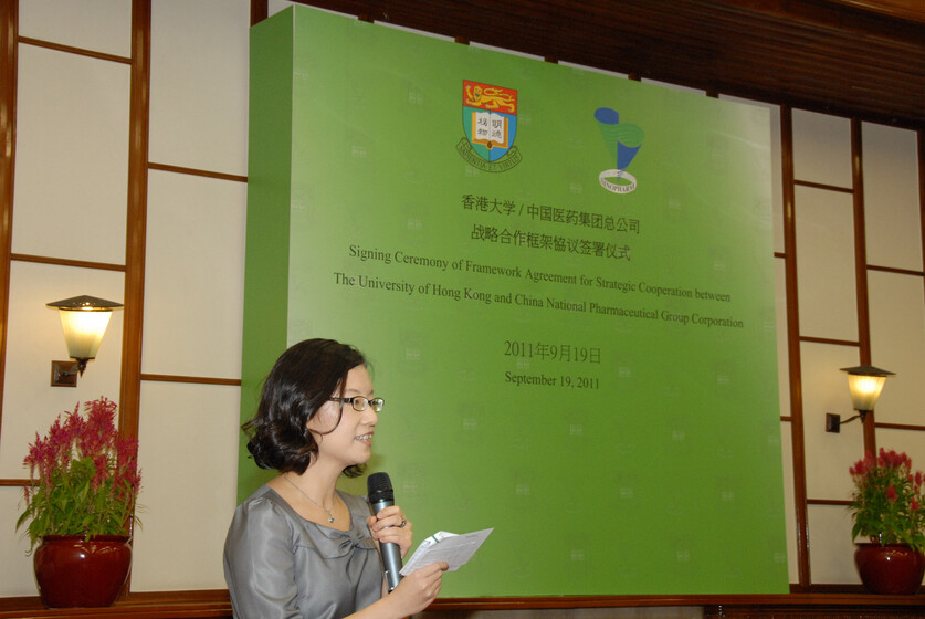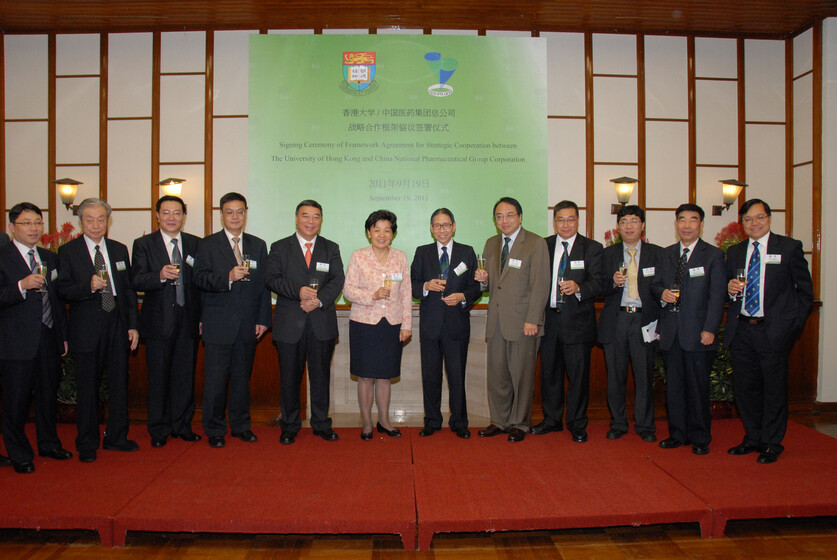 返回新聞In a signing ceremony organized by the Technology Transfer Office on September 19, 2011, HKU and China National Pharmaceutical Group have signed a strategic cooperation framework agreement. HKU Vice-Chancellor and President Professor Lap-Chee Tsui and President of China National Pharmaceutical Group Corporation Mr She Lulin have been the signees representing the two parties respectively at the ceremony. This is the first time an agreement is signed between HKU and a national pharmaceutical group. The move is an important step to mark the cooperation of the two institutions in translational pharmaceutical research and development. Under the agreement, the Group is granted distribution rights on the Mainland of an HKU developed leukaemia drug and the two institutions will join hands to develop an arrhythmia drug. HKU Vice-Chancellor Professor Lap-Chee Tsui said the agreement would foster collaborations in basic scientific research as well as pharmaceutical development. The University is also planning to send doctoral students on short-term internship at the company.