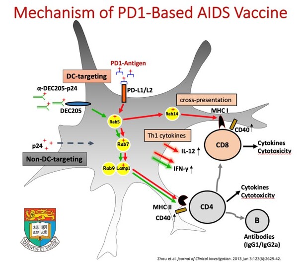 PD1疫苗主要通過投遞抗原刺激樹突狀細胞,達致增強抗體及啟動CD8+ T細胞免疫反應的效果。透過新型PD1為基礎疫苗的主動免疫,在預防及治療病毒感染及癌症時,增強宿主的免疫力,以長期控制癌症及病毒感染。此項目由香港大學微生物學系陳志偉教授、周京穎博士、譚志武博士、黃亦駿博士、陳鴻霖教授、袁國勇教授及劉利博士研究團隊研發。