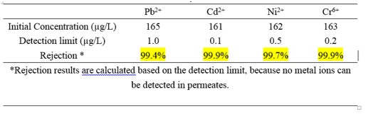 - The composite structure of the membrane create excellent antifouling and anti-bacterial properties. (high rejection for heavy metal ions (e.g., Pb2+, Cd2+, Ni2+ and Cr6+) and high water permeability: remove unwanted particles (e.g. suspended inorganic particles and organic particles), biological entities (e.g. pathogen and bacteria), and heavy metal ions (e.g. Pb2+, Cd2+, Ni2+ and Cr6+).