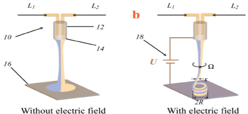 - With the voltage applied, the co-flow viscous fluids start to fold as shown in Figure 1(b)