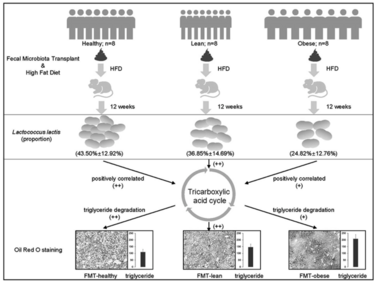 - Mice colonized with healthy microbiota had a significantly lower intrahepatic lipid accumulation than those with obese NAFLD microbiota. This suggested that changing gut microbiota condition may act as one of the biomarker for NAFLD risk evaluation and therapeutic target for treating/improving the NAFLD.
