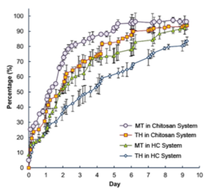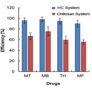 | lipophilic drugs | ✗ Limited due to its hydrophilic nature. Lipophilic drugs can hardly mix well with chitosan solutions | ✓ High due to the possibility of HC to homogeneously disperse the lipophilic drug molecules |